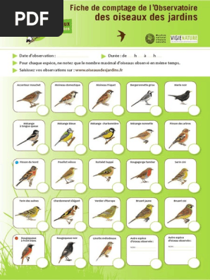 Saisissez vos observations sur le site de l'observatoire des oiseaux des jardins avant le 29 février 2016. .l'opération oiseaux des jardins vise à recenser de façon ponctuelle, l'abondance des principales espèces d'oiseaux fréquentant les jardins en hiver. Cette opération de sciences participatives se veut à la fois un moment de sensibilisation et d'information sur les oiseaux les plus communs. See more of oiseaux communs des jardins on facebook.